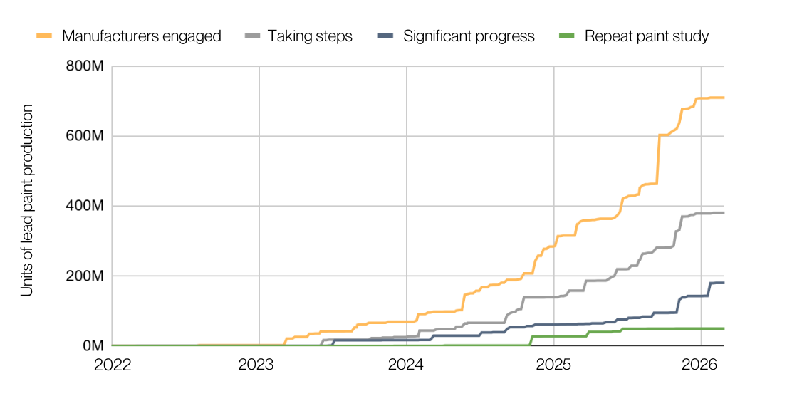 Across 22 countries, we engaged with manufacturers representing over 80% of the lead paint market, up from 12 in 2024. Testing confirmed that more manufacturers reformulated their products in Ghana, Colombia, Senegal, Zimbabwe, Pakistan, Malawi, South Africa, and Burundi.