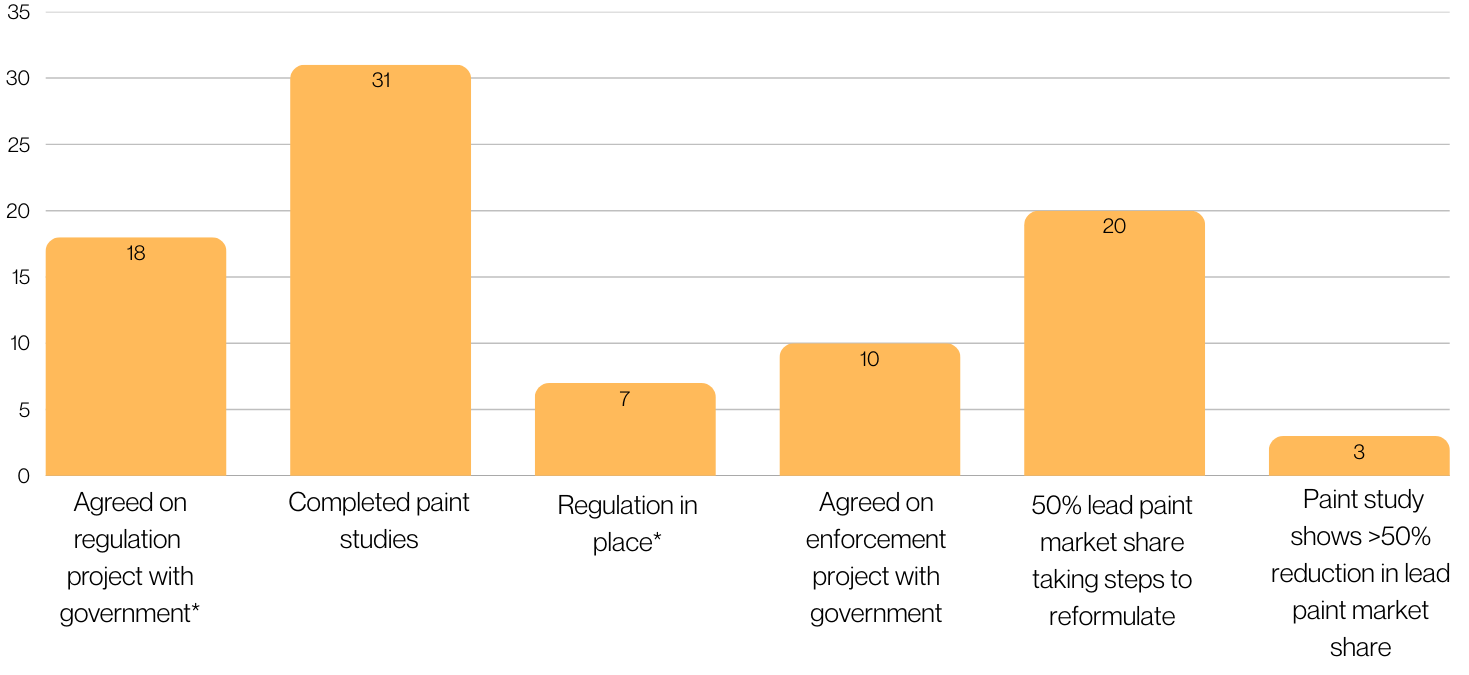 In 2025, five focus countries—Burundi, Liberia, Niger, Peru, and Sierra Leone—adopted new regulations limiting lead in paint. Enforcement also continued to be a priority. We agreed to work on enforcement measures with seven partner governments in 2025. In Ghana and Liberia, regulatory authorities warned more than 50% of the lead paint market share about their noncompliance with the recommended limit, while Pakistan issued penalties for violations.